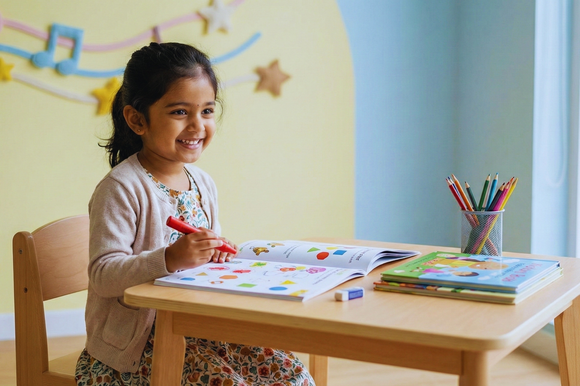 Our LKG program focuses on strengthening early academic skills while encouraging creativity, curiosity, and self-confidence. Through engaging activities, interactive learning, and guided exploration, children develop foundational literacy, numeracy, and social skills in a joyful and supportive learning environment.